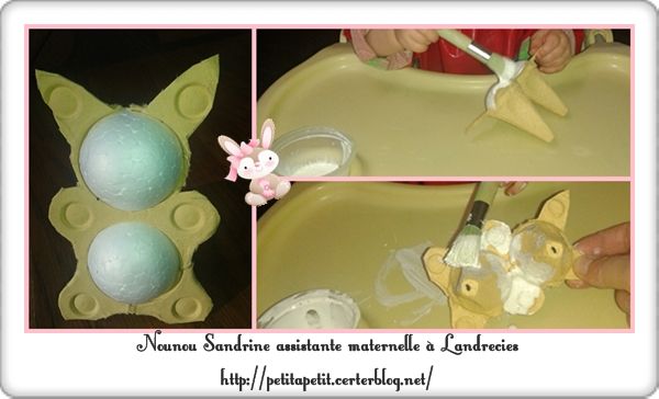 Dans une boite à oeufs nounou a découpé une forme de lapin, elle a ensuite comblé les deux trous (visage et ventre) avec une boule en polystyrène coupée en deux.